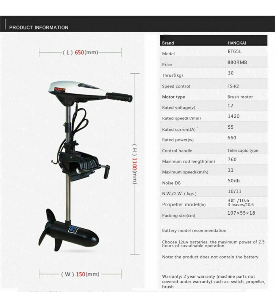 Hangkai 65lbs Electric Trolling Motor 12V 660W Outboard Engine Boat Brush Motor